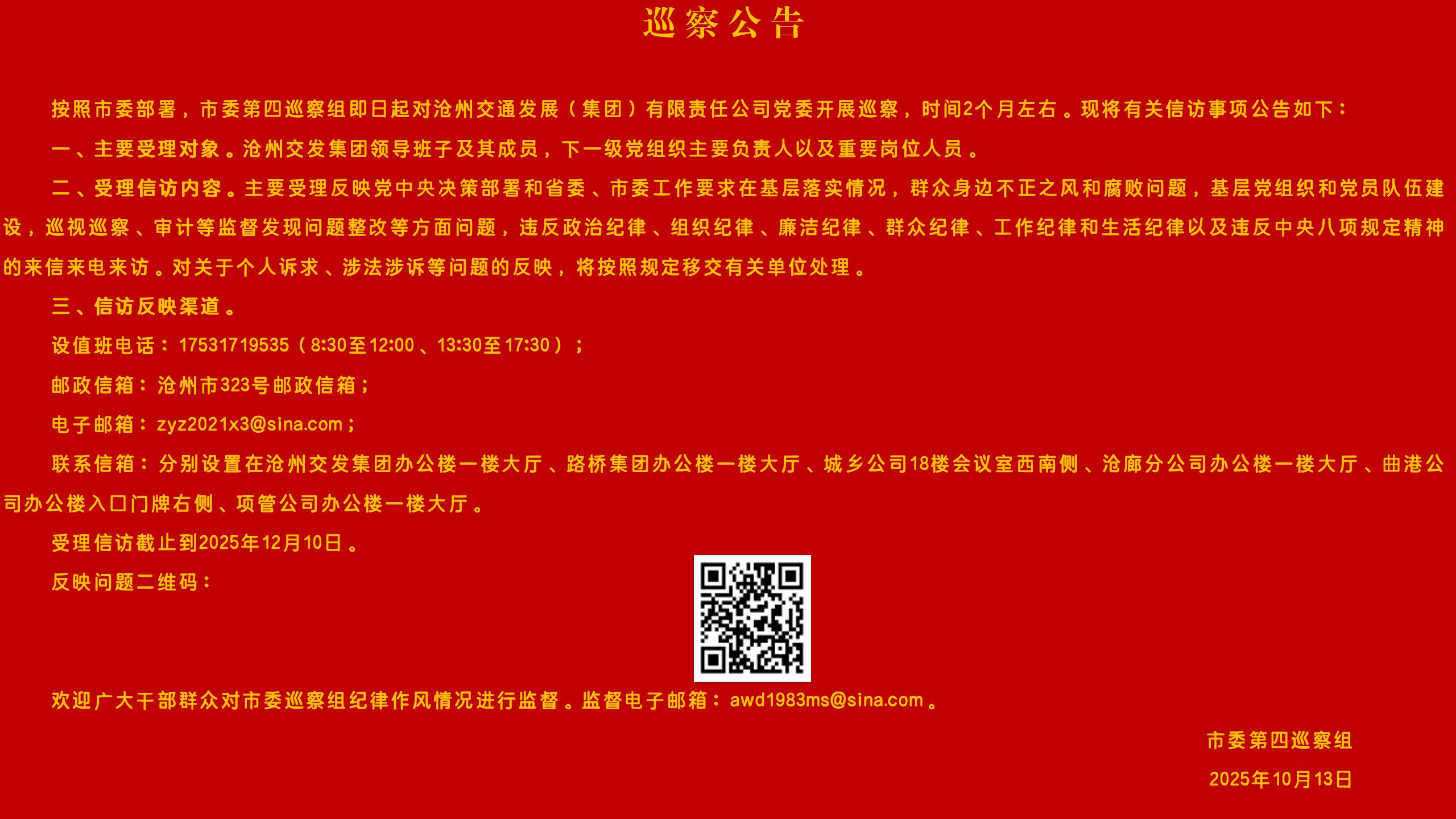 市委第四巡察組巡察 滄州交通發(fā)展(集團(tuán))有限責(zé)任公司黨委 工作動(dòng)員會(huì)召開 2025-10-17